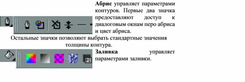 Абрис управляет параметрами контуров. Первые два значка предоставляют доступ к диалоговым окнам перо абриса и цвет абриса. |