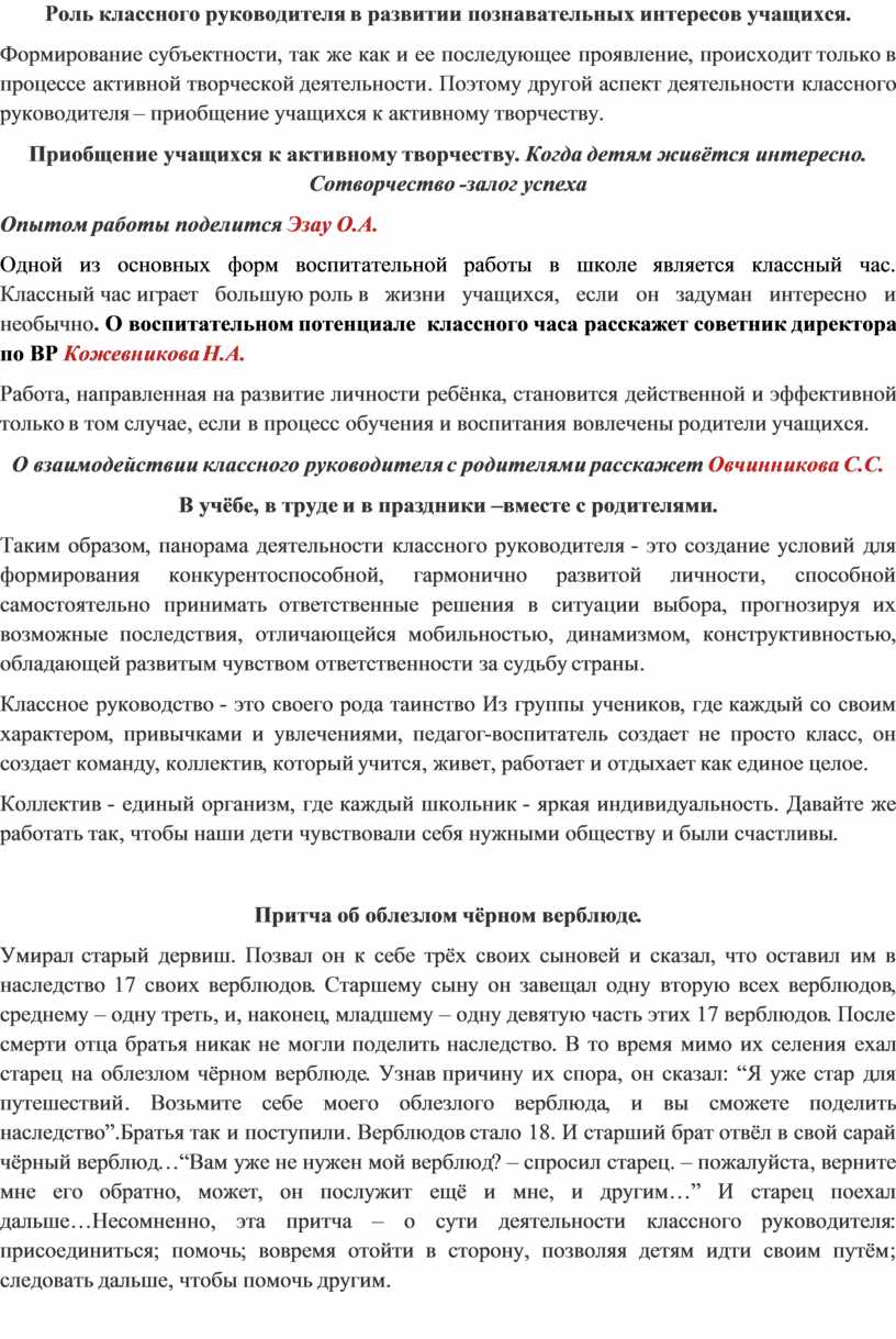 Умирал старый дервиш. Позвал он к себе трёх своих сыновей и сказал, что оставил им в наследство 17 своих верблюдов. Старшему сыну он завещал одну вторую всех верблюдов, среднему – одну треть, и, наконец, младшему – одну девятую часть этих 17 верблюдов. После смерти отца братья никак не могли поделить наследство. В то время мимо их селения ехал старец на облезлом чёрном верблюде. Узнав причину их спора, он сказал: “Я уже стар для путешествий. Возьмите себе моего облезлого верблюда, и вы сможете поделить наследство”.Братья так и поступили. Верблюдов стало 18. И старший брат отвёл в свой сарай 9 верблюдов, средний – 6, а младший – двоих. После этого в стороне остался стоять облезлый чёрный верблюд…“Вам уже не нужен мой верблюд? – спросил старец. – пожалуйста, верните мне его обратно, может, он послужит ещё и мне, и другим…” И старец поехал дальше…Несомненно, эта притча – о сути деятельности классного руководителя: присоединиться; помочь; вовремя отойти в сторону, позволяя детям идти своим путём; следовать дальше, чтобы помочь другим.