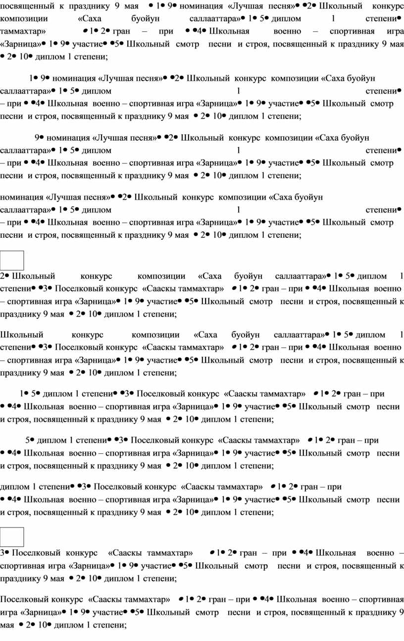 · Участие в концерте жителей түөлбэ «Сардана», участие в фестивале художественной самодеятельности учреждений к 75-летию Победы, участие в выставке прикладного искусства в День Семьи, День Учителя.