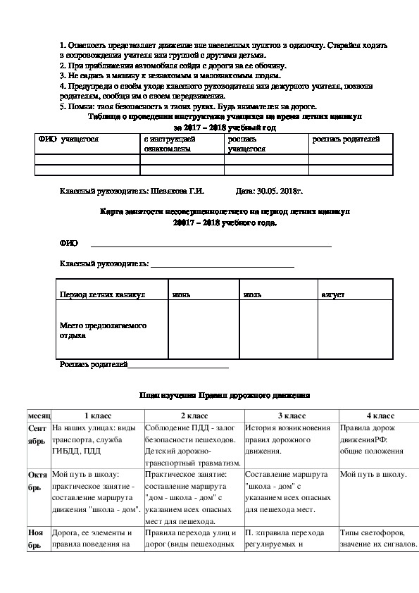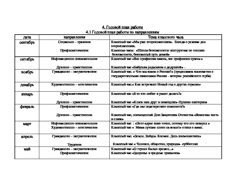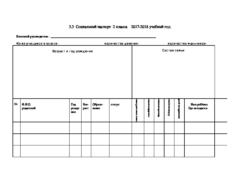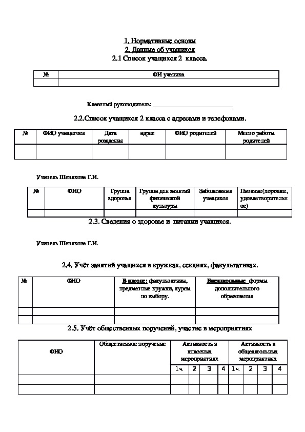 Папка классного руководителя содержит информацию нормативные документы, цели и задачи воспитательной работы, социальный паспорт класса; годовой план работы, таблицы: данные об учащихся, сведения о здоровье и питании учащихся, учёт занятости учащихся в кружках, секциях, факультативах, учёт общественных поручений, участие в мероприятиях.Папка классного руководителя содержит информацию нормативные документы, цели и задачи воспитательной работы, социальный паспорт класса.
