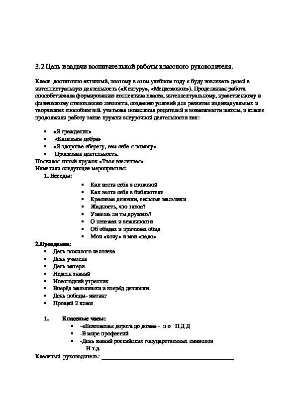 чтобы жизнь в классе была интересной, а стиль общения мягким и доверительным.3.2 Цель и задачи воспитательной работы классного руководителя.
