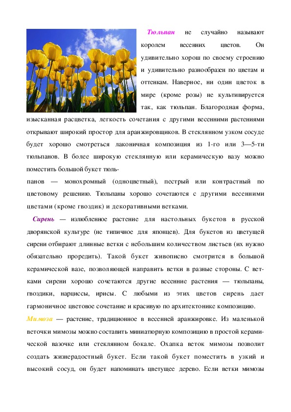 цветовому решению. Тюльпаны хорошо сочетаются с другими весенними