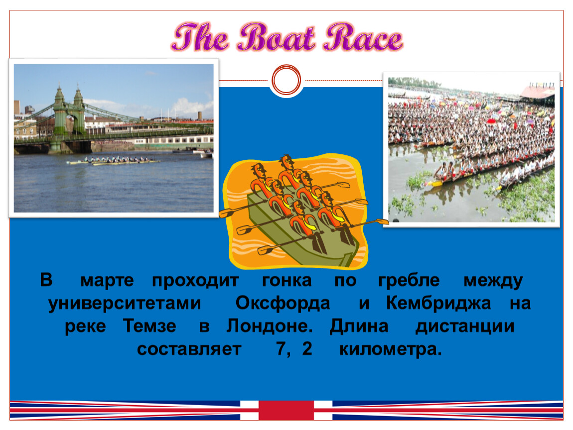 В марте проходит гонка по гребле между университетами Оксфорда и Кембриджа на реке Темзе в Лондоне. Длина дистанции составляет 7, 2 километра.