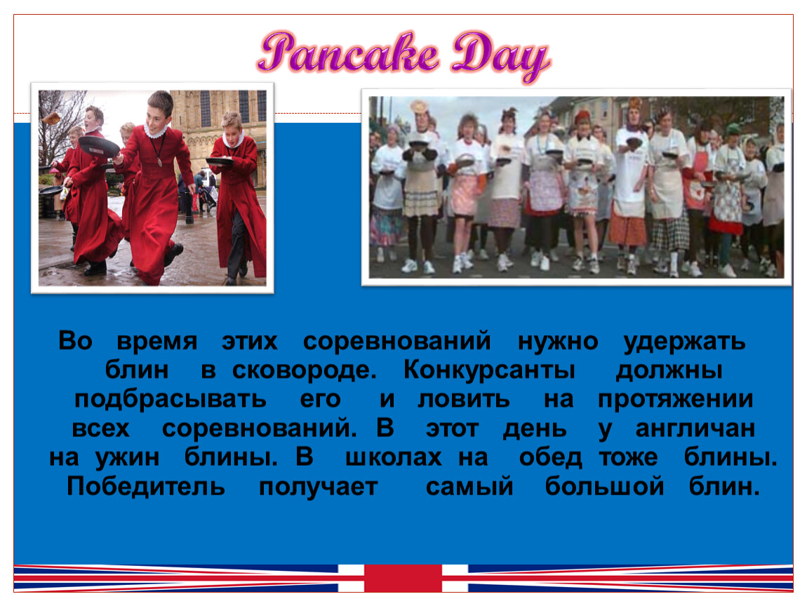 Во время этих соревнований нужно удержать блин в сковороде. Конкурсанты должны подбрасывать его и ловить на протяжении всех соревнований. В этот день у англичан на ужин блины. В школах на обед тоже блины. Победитель получает самый большой блин.