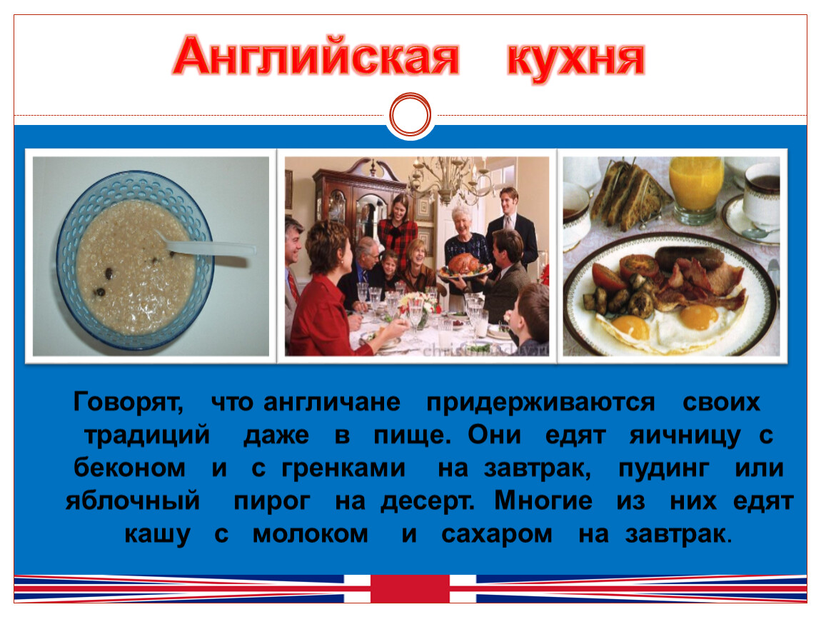Говорят, что англичане придерживаются своих традиций даже в пище. Они едят яичницу с беконом и с гренками на завтрак, пудинг или яблочный пирог на десерт. Многие из них едят кашу с молоком и сахаром на завтрак.