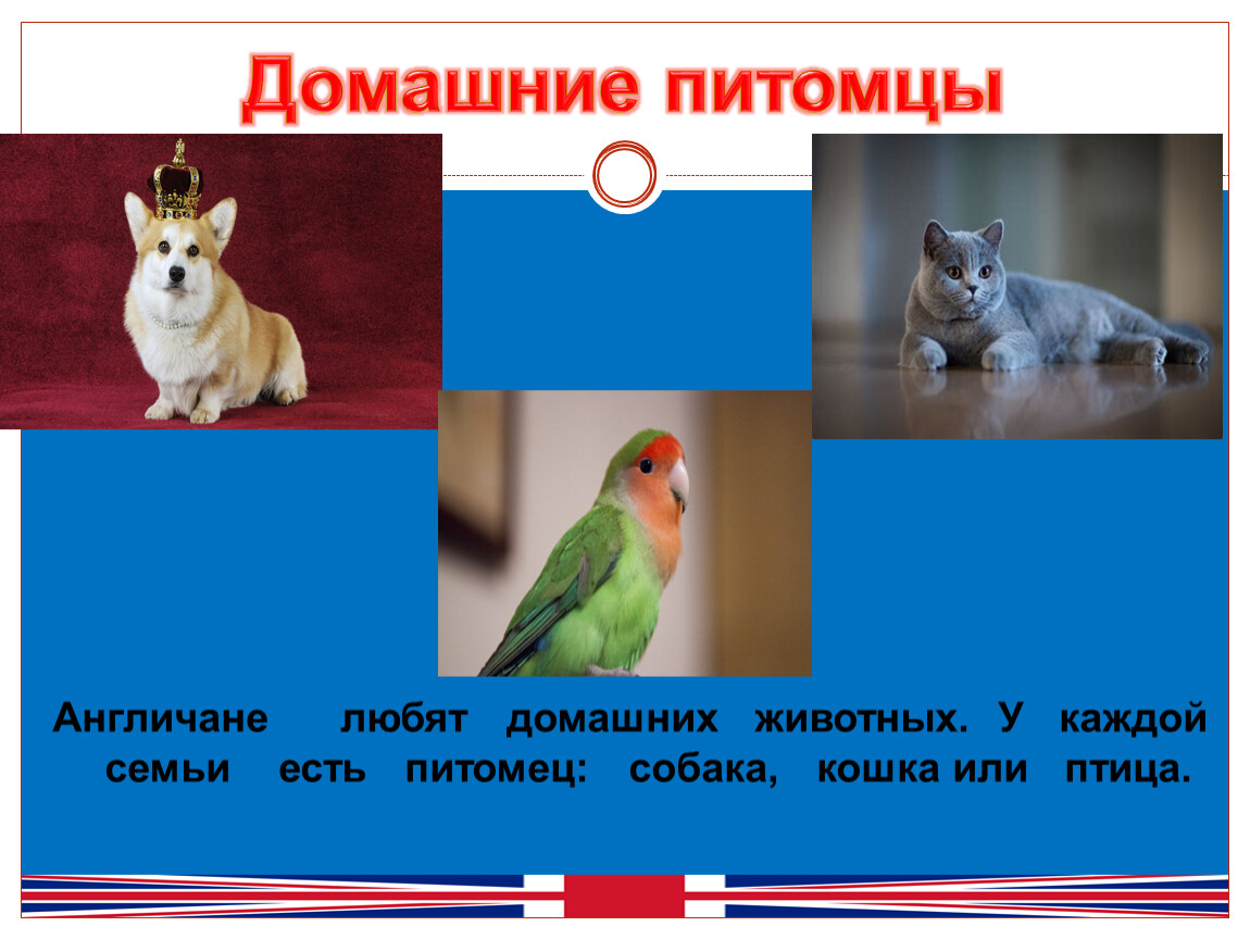 Англичане любят домашних животных. У каждой семьи есть питомец: собака, кошка или птица.