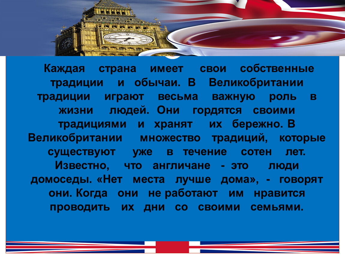 Каждая страна имеет свои собственные традиции и обычаи. В Великобритании традиции играют весьма важную роль в жизни людей. Они гордятся своими традициями и хранят их бережно. В Великобритании множество традиций, которые существуют уже в течение сотен лет. Известно, что англичане - это люди домоседы. «Нет места лучше дома», - говорят они. Когда они не работают им нравится проводить их дни со своими семьями.