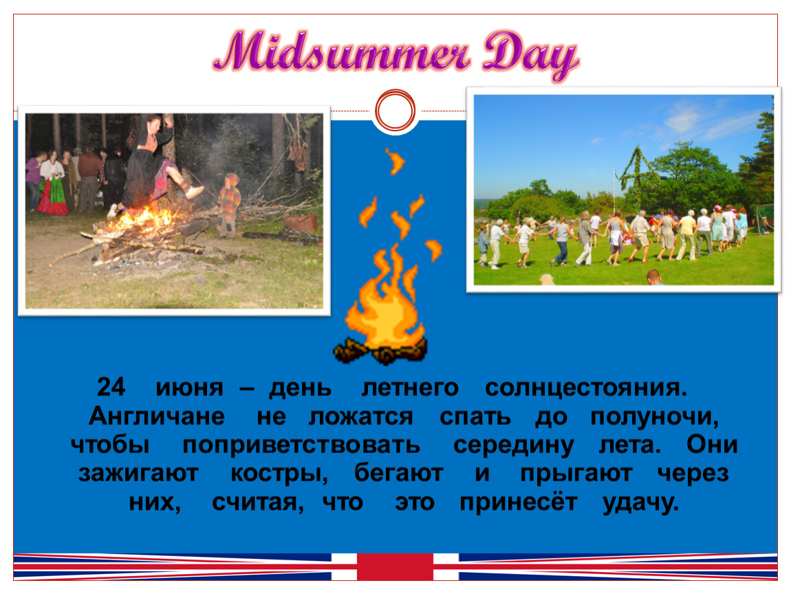 24 июня – день летнего солнцестояния. Англичане не ложатся спать до полуночи, чтобы поприветствовать середину лета. Они зажигают костры, бегают и прыгают через них, считая, что это принесёт удачу.