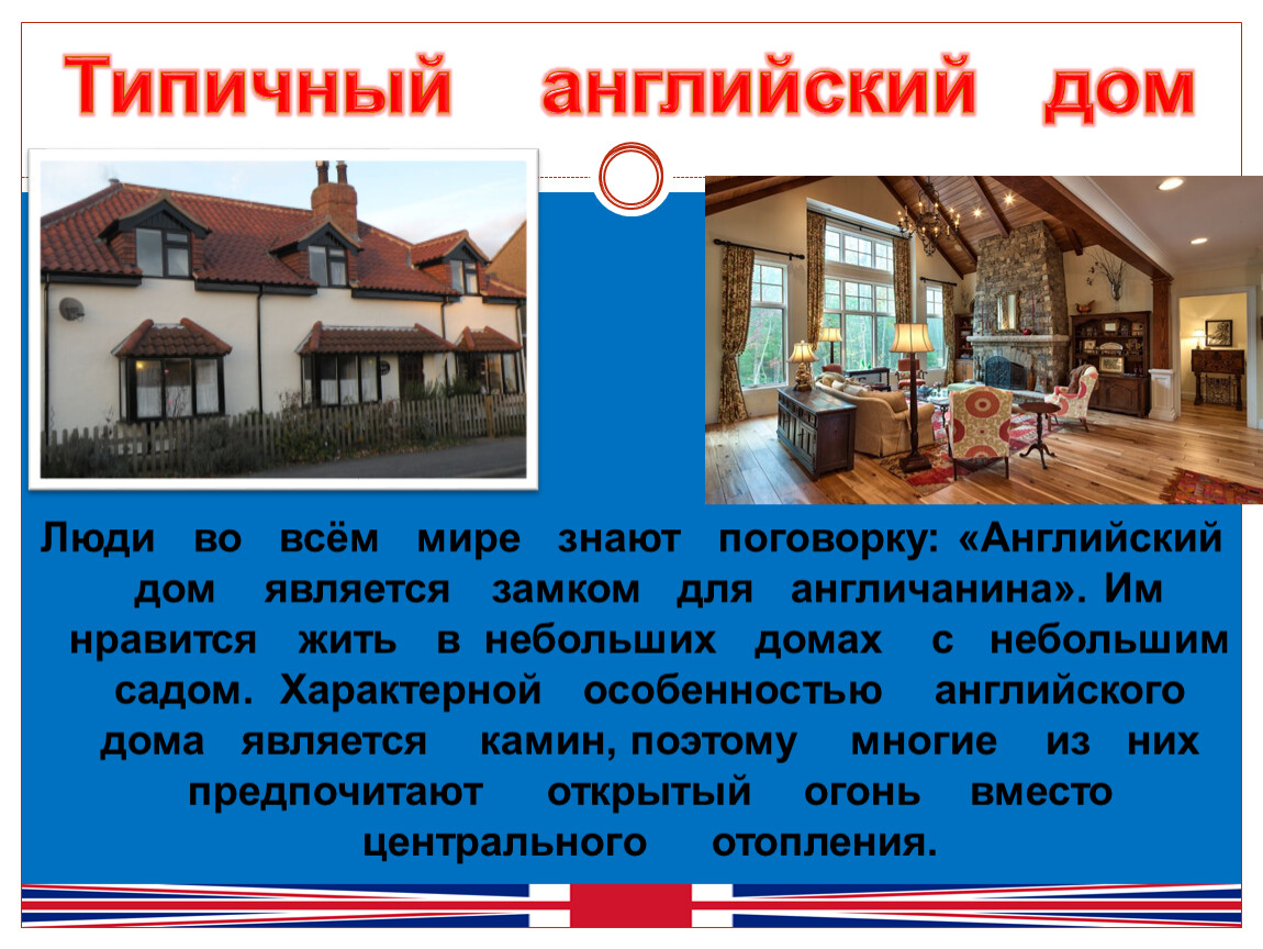 Люди во всём мире знают поговорку: «Английский дом является замком для англичанина». Им нравится жить в небольших домах с небольшим садом. Характерной особенностью английского дома является камин, поэтому многие из них предпочитают открытый огонь вместо центрального отопления.