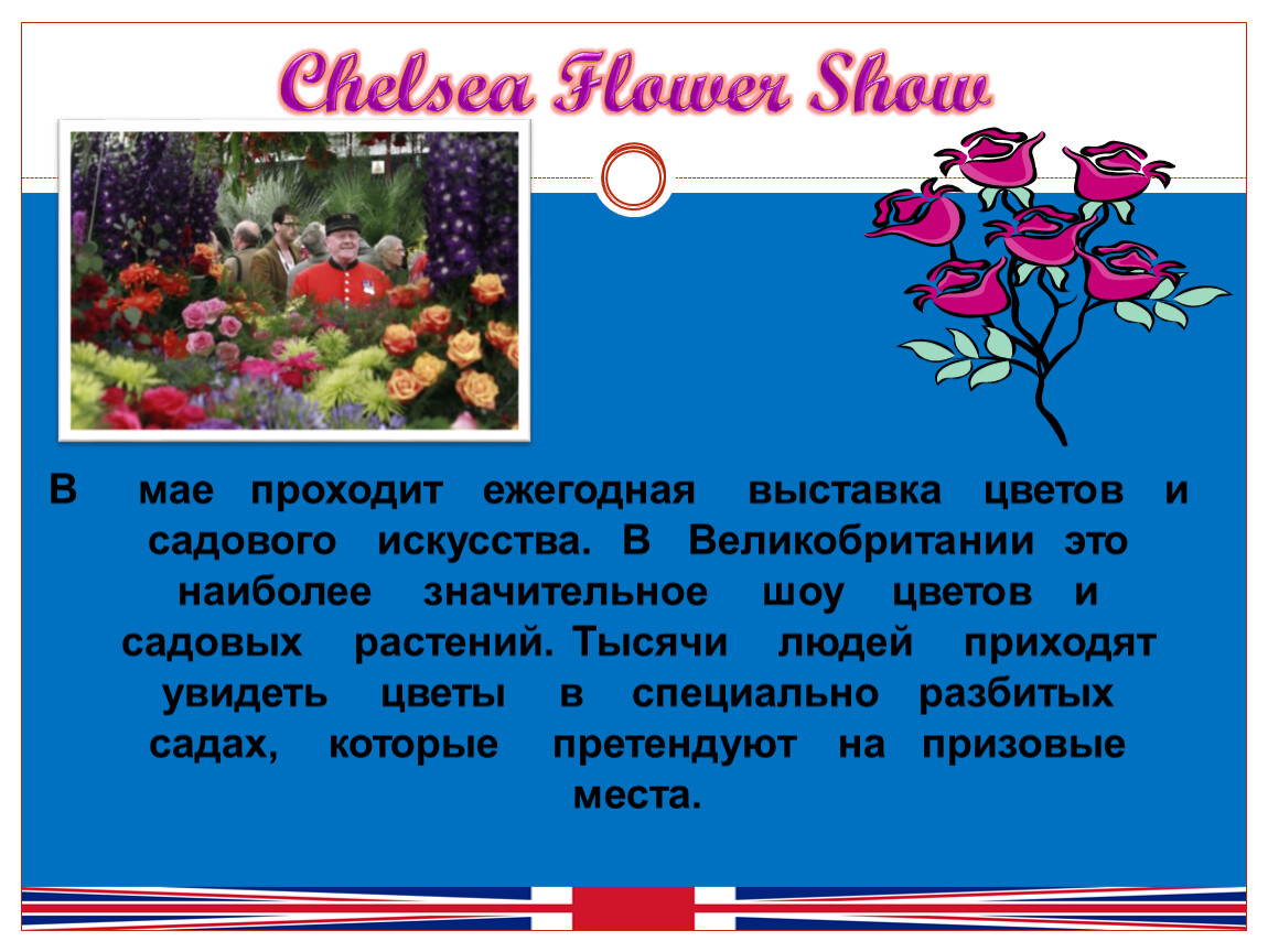 В мае проходит ежегодная выставка цветов и садового искусства. В Великобритании это наиболее значительное шоу цветов и садовых растений. Тысячи людей приходят увидеть цветы в специально разбитых садах, которые претендуют на призовые места.