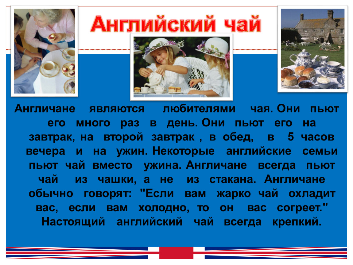 Англичане являются любителями чая. Они пьют его много раз в день. Они пьют его на завтрак, на второй завтрак , в обед, в 5 часов вечера и на ужин. Некоторые английские семьи пьют чай вместо ужина. Англичане всегда пьют чай из чашки, а не из стакана. Англичане обычно говорят: "Если вам жарко чай охладит вас, если вам холодно, то он вас согреет." Настоящий английский чай всегда крепкий.