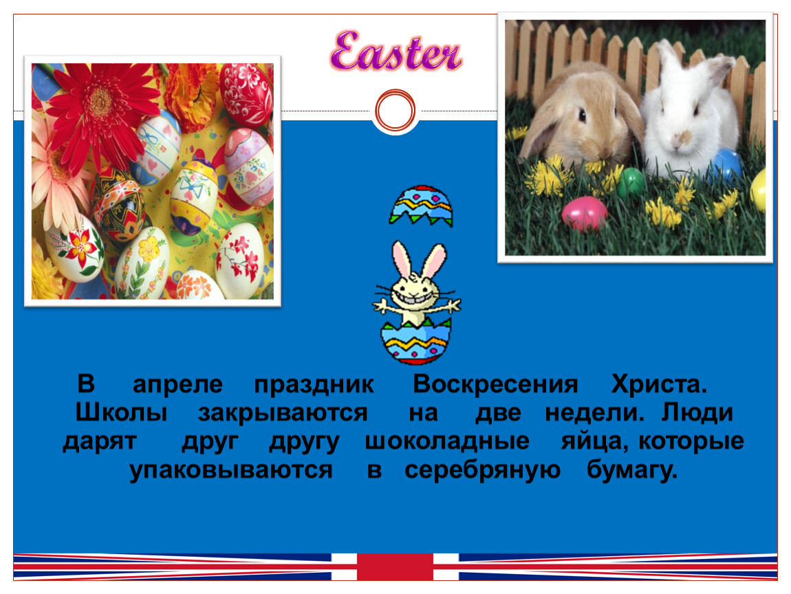 В апреле праздник Воскресения Христа. Школы закрываются на две недели. Люди дарят друг другу шоколадные яйца, которые упаковываются в серебряную бумагу.
