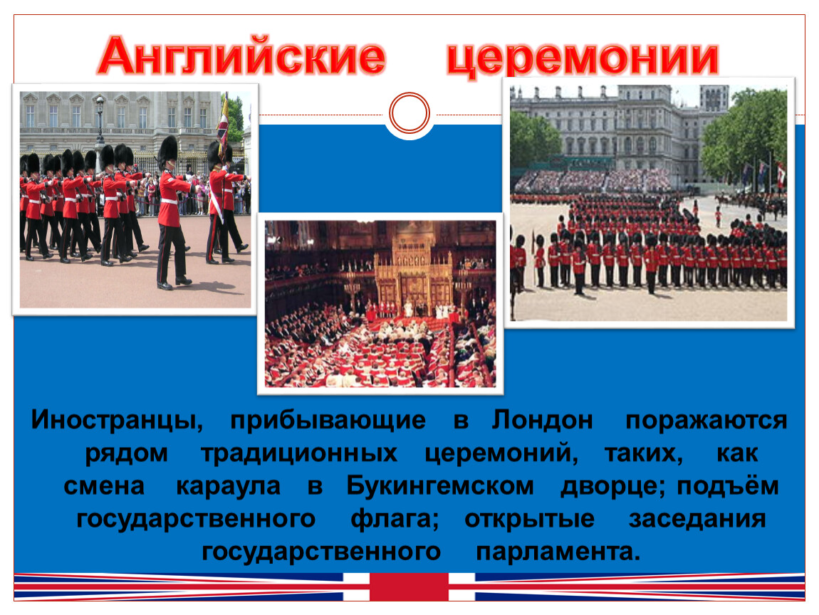 Иностранцы, прибывающие в Лондон поражаются рядом традиционных церемоний, таких, как смена караула в Букингемском дворце; подъём государственного флага; открытые заседания государственного парламента.
