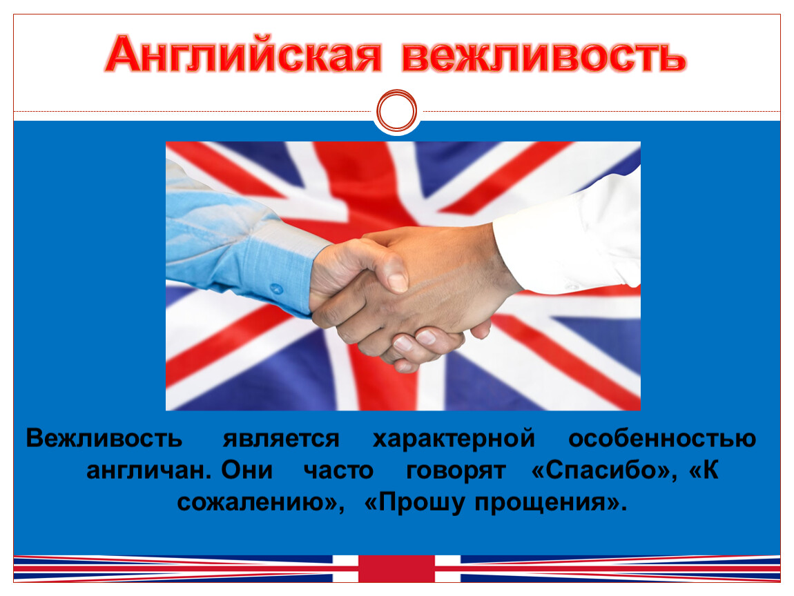 Вежливость является характерной особенностью англичан. Они часто говорят «Спасибо», «К сожалению», «Прошу прощения».