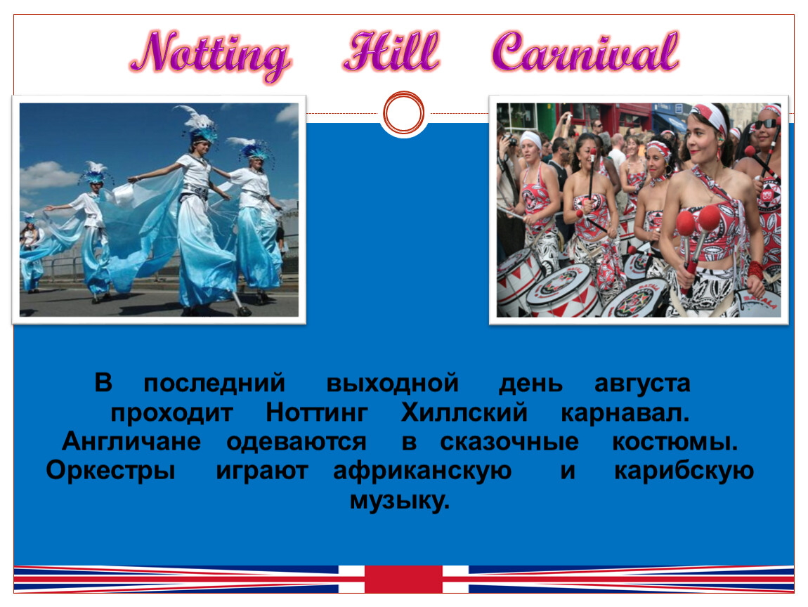 В последний выходной день августа проходит Ноттинг Хиллский карнавал. Англичане одеваются в сказочные костюмы. Оркестры играют африканскую и карибскую музыку.
