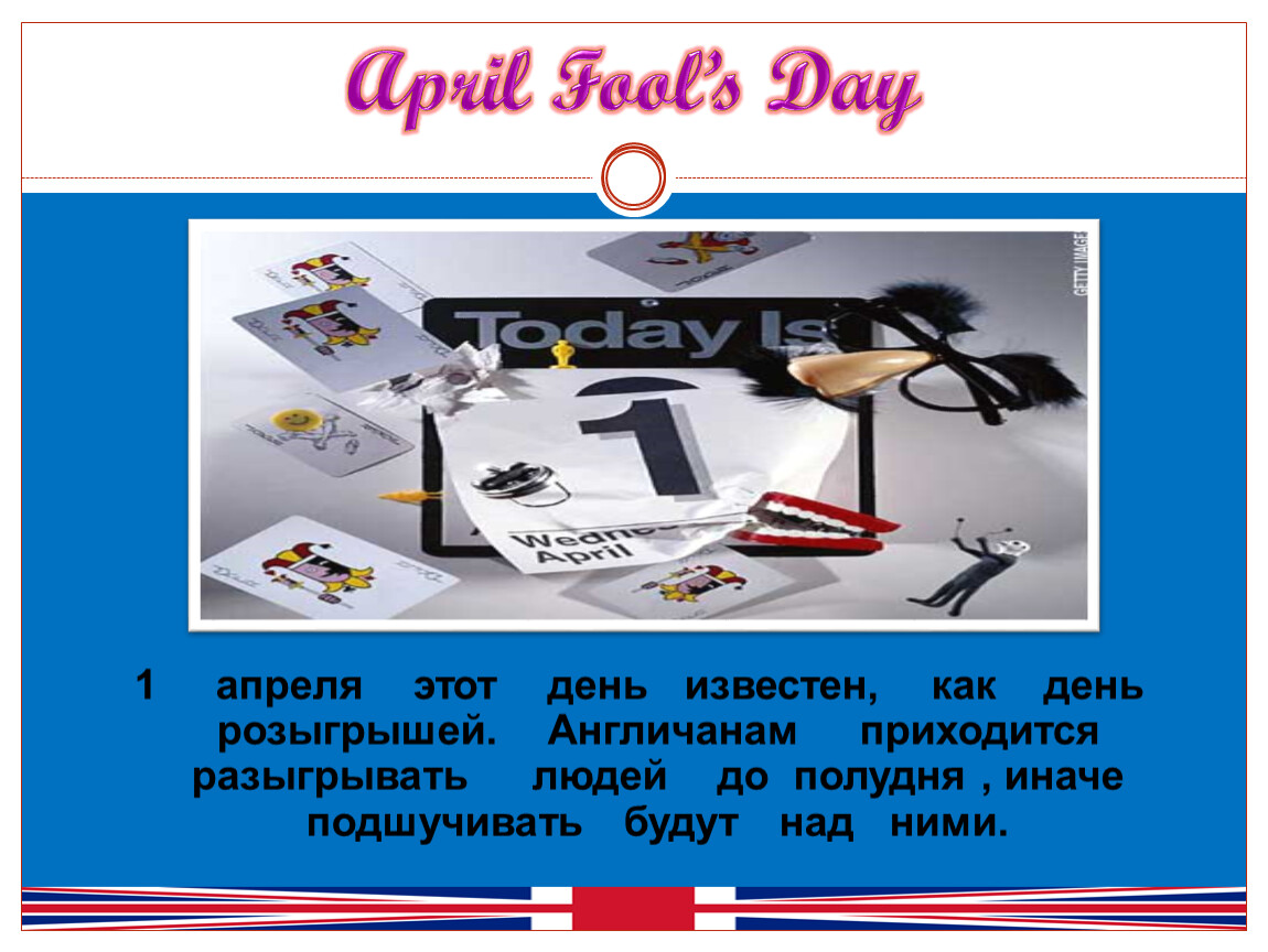1 апреля этот день известен, как день розыгрышей. Англичанам приходится разыгрывать людей до полудня , иначе подшучивать будут над ними.