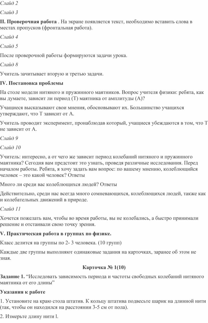 Учитель: интересно, а от чего же зависит период колебаний нитяного и пружинного маятника? Сегодня вам предстоит это узнать, проведя различные исследования. Перед началом работы. Ребята, я хочу задать вам вопрос: по вашему мнению, колеблющийся человек – это какой человек? Ответы