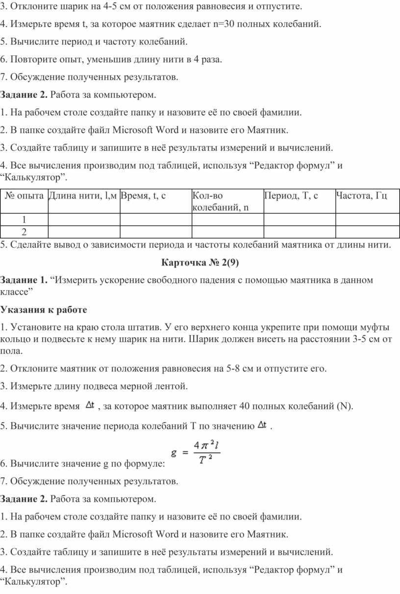 Задание 1. “Исследовать зависимость периода и частоты свободных колебаний нитяного маятника от его длины”