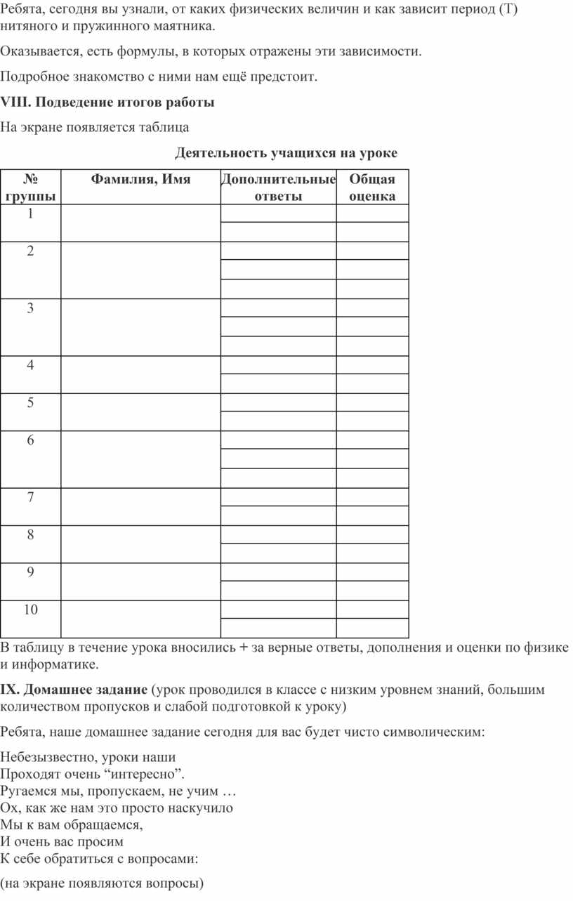 IX. Домашнее задание (урок проводился в классе с низким уровнем знаний, большим количеством пропусков и слабой подготовкой к уроку)