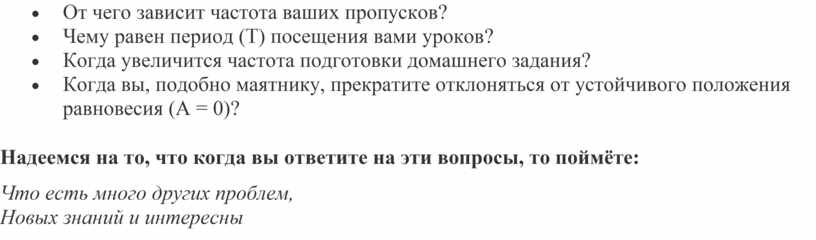 Ребята, сегодня вы узнали, от каких физических величин и как зависит период (Т) нитяного и пружинного маятника.