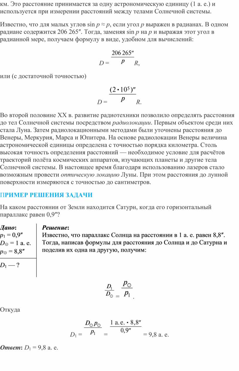 Решение: Известно, что параллакс Солнца на расстоянии в 1 а. е. равен 8,8ʺ. Тогда, написав формулы для расстояния до Солнца и до Сатурна и поделив их одна на другую, получим: |