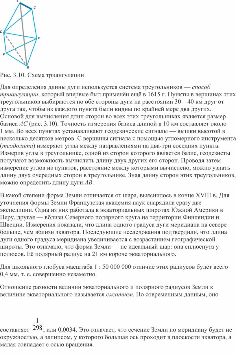 Для определения длины дуги используется система треугольников — способ триангуляции, который впервые был применён ещё в 1615 г. Пункты в вершинах этих треугольников выбираются по обе стороны дуги на расстоянии 30—40 км друг от друга так, чтобы из каждого пункта были видны по крайней мере два других. Основой для вычисления длин сторон во всех этих треугольниках является размер базиса AC (рис. 3.10). Точность измерения базиса длиной в 10 км составляет около 1 мм. Во всех пунктах устанавливают геодезические сигналы — вышки высотой в несколько десятков метров. С вершины сигнала с помощью угломерного инструмента (теодолита) измеряют углы между направлениями на два-три соседних пункта. Измерив углы в треугольнике, одной из сторон которого является базис, геодезисты получают возможность вычислить длину двух других его сторон. Проводя затем измерение углов из пунктов, расстояние между которыми вычислено, можно узнать длину двух очередных сторон в треугольнике. Зная длину сторон этих треугольников, можно определить длину дуги AB.