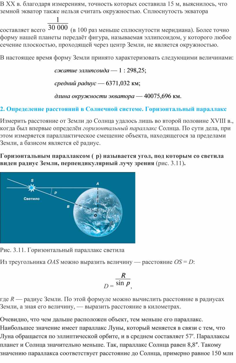 Горизонтальным параллаксом ( p) называется угол, под которым со светила виден радиус Земли, перпендикулярный лучу зрения (рис. 3.11).
