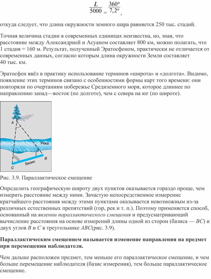 Определить географическую широту двух пунктов оказывается гораздо проще, чем измерить расстояние между ними. Зачастую непосредственное измерение кратчайшего расстояния между этими пунктами оказывается невозможным из-за различных естественных препятствий (гор, рек и т. п.). Поэтому применяется способ, основанный на явлении параллактического смещения и предусматривающий вычисление расстояния на основе измерений длины одной из сторон (базиса — BC) и двух углов B и C в треугольнике ABC(рис. 3.9).