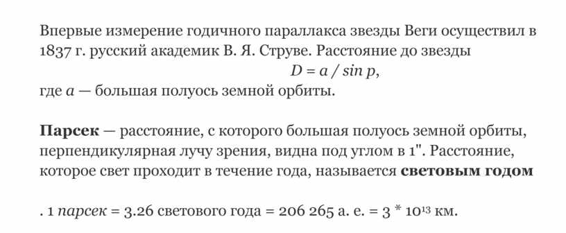 Впервые измерение годичного параллакса звезды Веги осуществил в 1837 г. русский академик В. Я. Струве. Расстояние до звезды