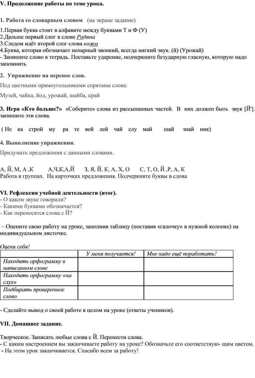 – Оцените свою работу на уроке, заполнив таблицу (поставив «галочку» в нужной колонке) на индивидуальном листочке.