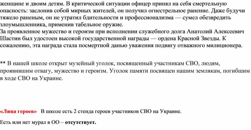 ** В нашей школе открыт музейный уголок, посвященный участникам СВО, людям, проявившим отвагу, мужество и героизм. Уголок памяти посвящен нашим землякам, погибшим в ходе СВО на Украине.