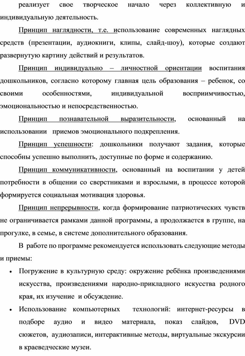 Принцип непрерывности, когда формирование патриотических чувств не ограничивается рамками данной программы, а продолжается в группе, на прогулке, в семье, в системе дополнительного образования.