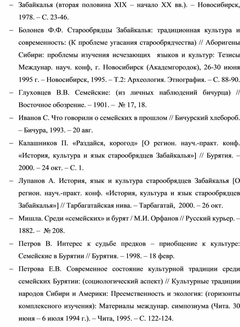 - Болонев Ф.Ф. Старообрядцы Забайкалья: традиционная культура и современность: (К проблеме угасания старообрядчества) // Аборигены Сибири: проблемы изучения исчезающих языков и культур: Тезисы Междунар. науч. конф, г. Новосибирск (Академгородок), 26-30 июня 1995 г. – Новосибирск, 1995. – Т.2: Археология. Этнография. – С. 88-90.