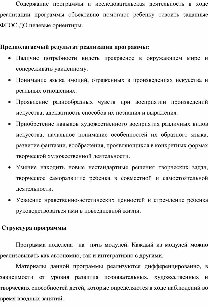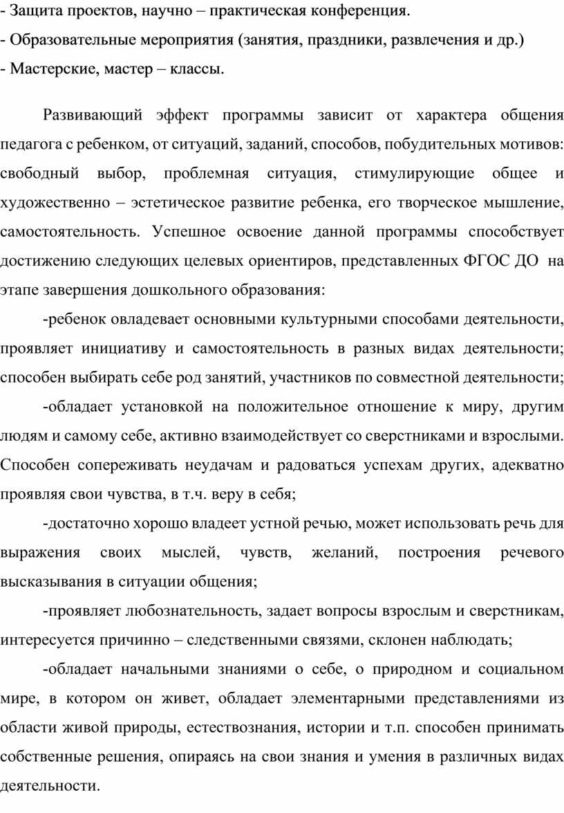 Развивающий эффект программы зависит от характера общения педагога с ребенком, от ситуаций, заданий, способов, побудительных мотивов: свободный выбор, проблемная ситуация, стимулирующие общее и художественно – эстетическое развитие ребенка, его творческое мышление, самостоятельность. Успешное освоение данной программы способствует достижению следующих целевых ориентиров, представленных ФГОС ДО на этапе завершения дошкольного образования: