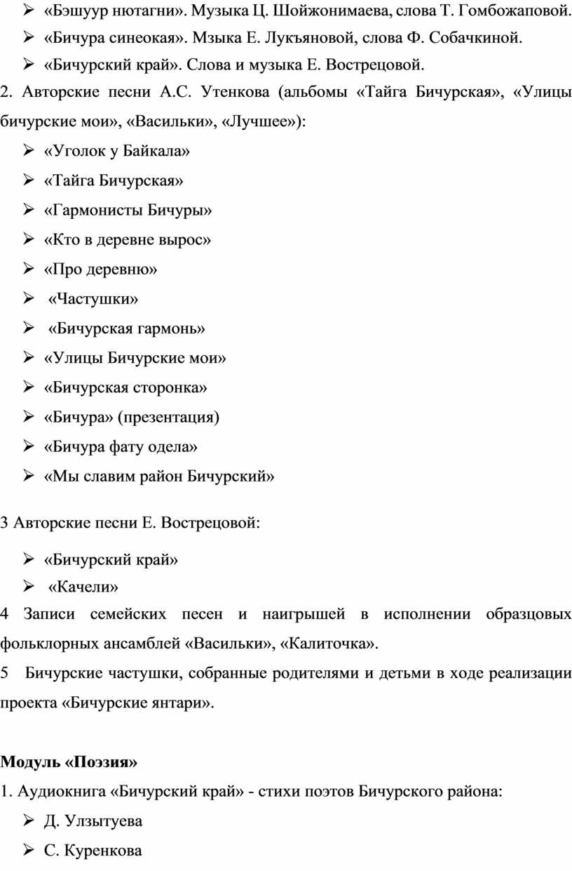- «Бичурский край», слова и музыка Е. Вострецовой.