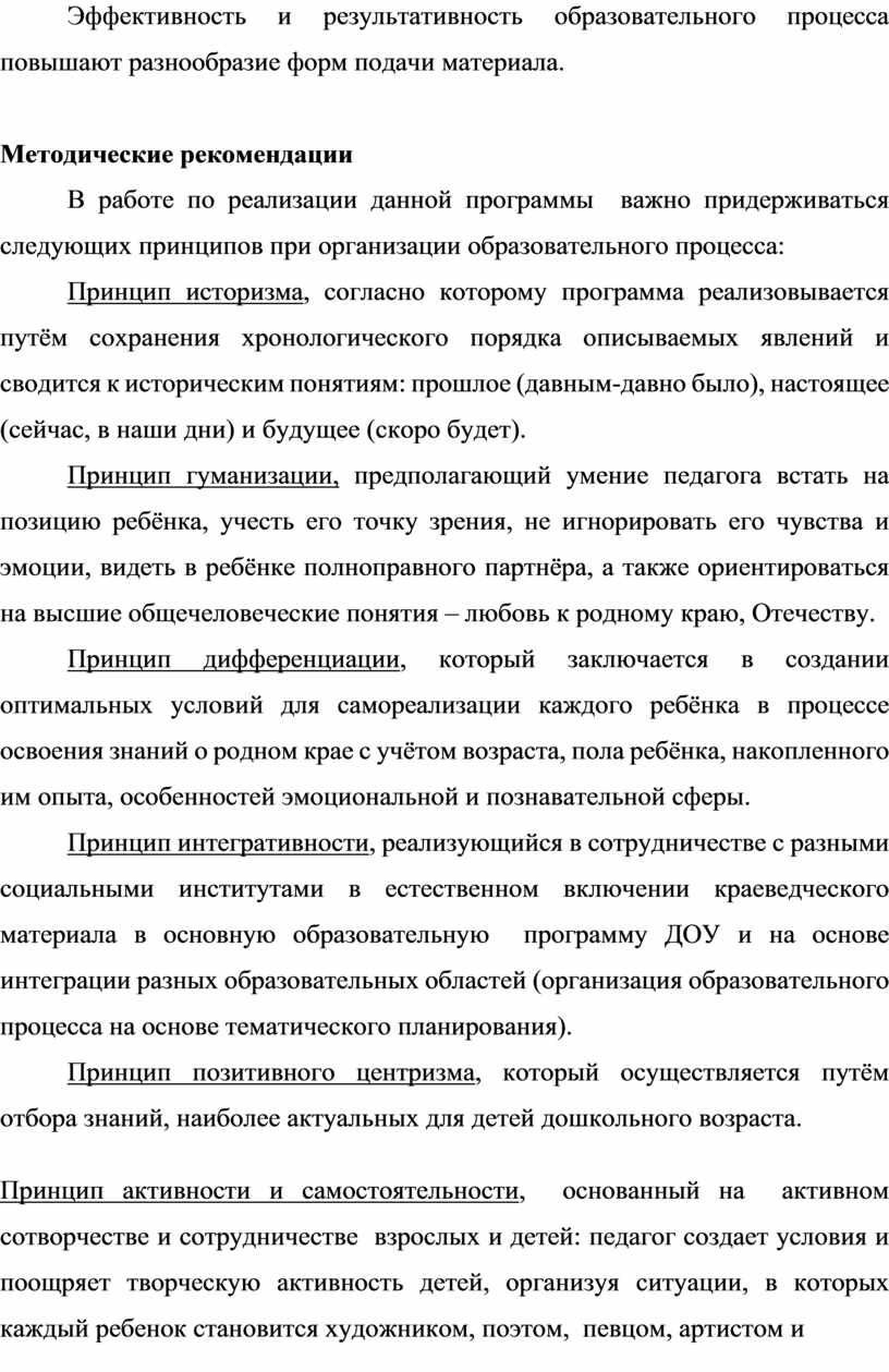 Принцип интегративности, реализующийся в сотрудничестве с разными социальными институтами в естественном включении краеведческого материала в основную образовательную программу ДОУ и на основе интеграции разных образовательных областей (организация образовательного процесса на основе тематического планирования).