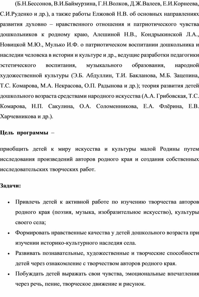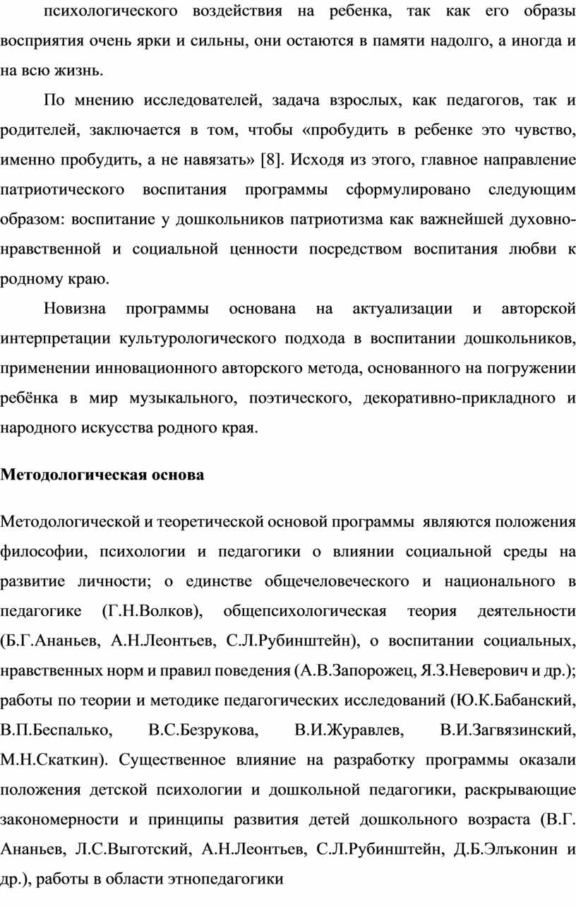 Методологической и теоретической основой программы являются положения философии, психологии и педагогики о влиянии социальной среды на развитие личности; о единстве общечеловеческого и национального в педагогике (Г.Н.Волков), общепсихологическая теория деятельности (Б.Г.Ананьев, А.Н.Леонтьев, С.Л.Рубинштейн), о воспитании социальных, нравственных норм и правил поведения (А.В.Запорожец, Я.З.Неверович и др.); работы по теории и методике педагогических исследований (Ю.К.Бабанский, В.П.Беспалько, В.С.Безрукова, В.И.Журавлев, В.И.Загвязинский, М.Н.Скаткин). Существенное влияние на разработку программы оказали положения детской психологии и дошкольной педагогики, раскрывающие закономерности и принципы развития детей дошкольного возраста (В.Г. Ананьев, Л.С.Выготский, А.Н.Леонтьев, С.Л.Рубинштейн, Д.Б.Элъконин и др.), работы в области этнопедагогики (Б.Н.Бессонов, В.И.Баймурзина, Г.Н.Волков, Д.Ж.Валеев, Е.И.Корнеева, С.И.Руденко и др.), а также работы Елжовой Н.В. об основных направлениях развития духовно – нравственного отношения и патриотического чувства дошкольников к родному краю, Алешиной Н.В., Кондрыкинской Л.А., Новицкой М.Ю., Мулько И.Ф. о патриотическом воспитании дошкольника и наследии человека в истории и культуре и др., ведущие разработки педагогики эстетического воспитания, музыкального образования, народной художественной культуры (Э.Б. Абдуллин, Т.И. Бакланова, М.Б. Зацепина, Т.С. Комарова, М.А. Некрасова, О.П. Радынова и др.); теория развития детей дошкольного возраста средствами народного искусства (А.А. Грибовская, Т.С. Комарова, Н.П. Сакулина, О.А. Соломенникова, Е.А. Флёрина, Е.В. Харчевникова и др.).