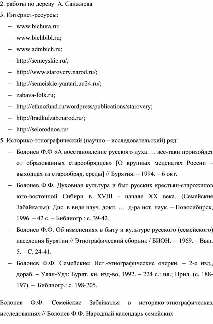 - Болонев Ф.Ф. Духовная культура и быт русских крестьян-старожилов юго-восточной Сибири в XVIII - начале ХХ века. (Семейские Забайкалья): Дис. в виде науч. докл. … д-ра ист. наук. – Новосибирск, 1996. – 42 с. – Библиогр.: с. 39-42.