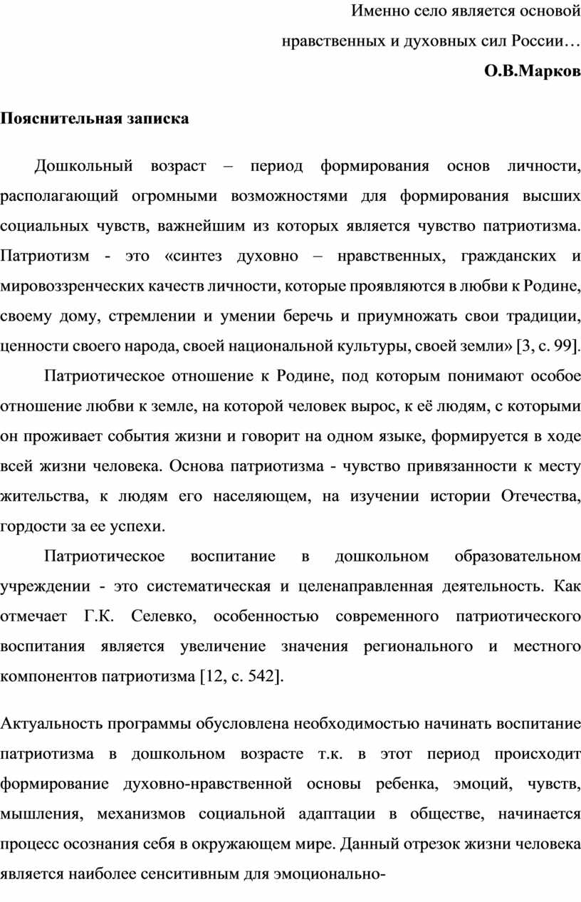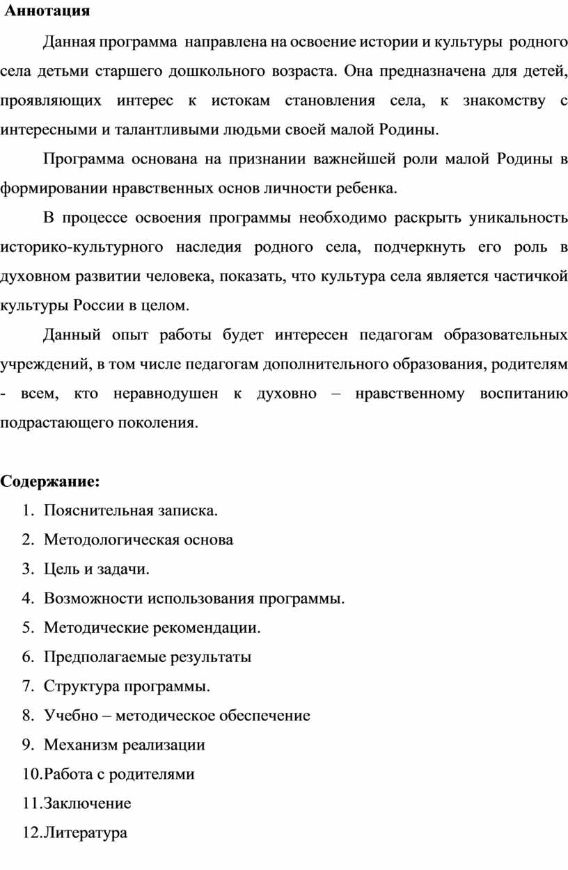 Данная программа направлена на освоение истории и культуры родного села детьми старшего дошкольного возраста. Она предназначена для детей, проявляющих интерес к истокам становления села, к знакомству с интересными и талантливыми людьми своей малой Родины.