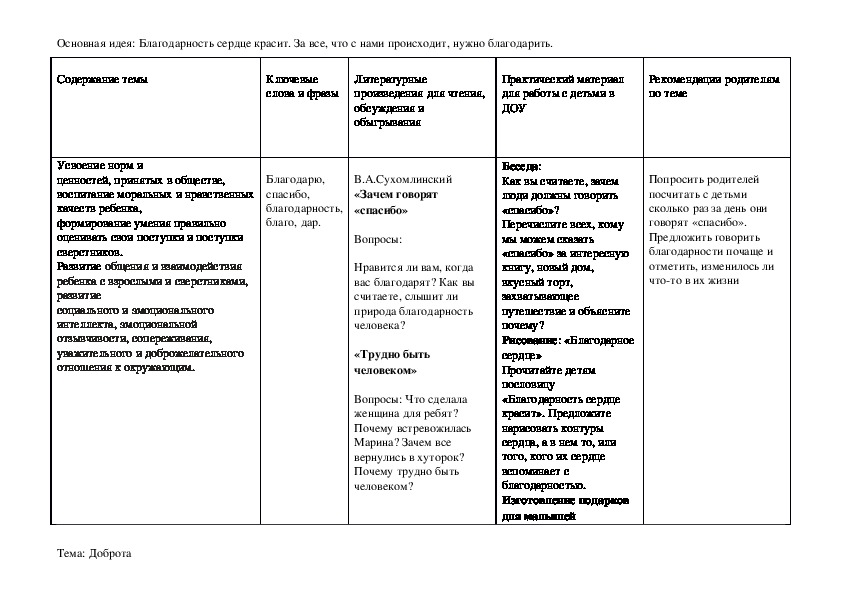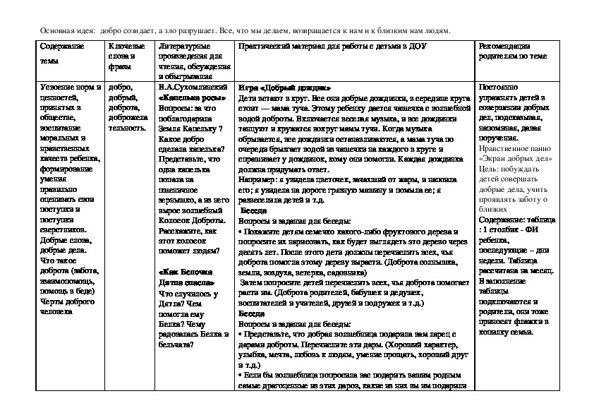 В основу программы легли литературные произведения В.А.Сухомлинского. Программа направлена на развитие личностной культуры дошкольников, активное освоение детьми норм общечеловеческой морали, формирование у детей старшего дошкольного возраста таких качеств, как доброжелательность, милосердие, уважение к старшим, любовь к матери, семье, Родине.Программа включает в себя систему развивающих заданий для детей дошкольного возраста. Задания предполагают разные формы взаимодействия детей и взрослых (игры, занятия, беседы). Кроме этого программа содержит материал для мониторинга усвоения материала, рекомендации для родителей по работе над темами.Программа "Тропинки добра" создана для работы с детьми старшего дошкольного возраста на основе литературных произведений В.А.Сухомлинского. Материал носит практико-ориентированный характер. Содержит не только целевые ориентиры и содержание работы, но и обширный практический материал для работы с группой, (подгруппой) детей, рекомендации родителям, а также тексты литературных произведений и вопросы к ним.
