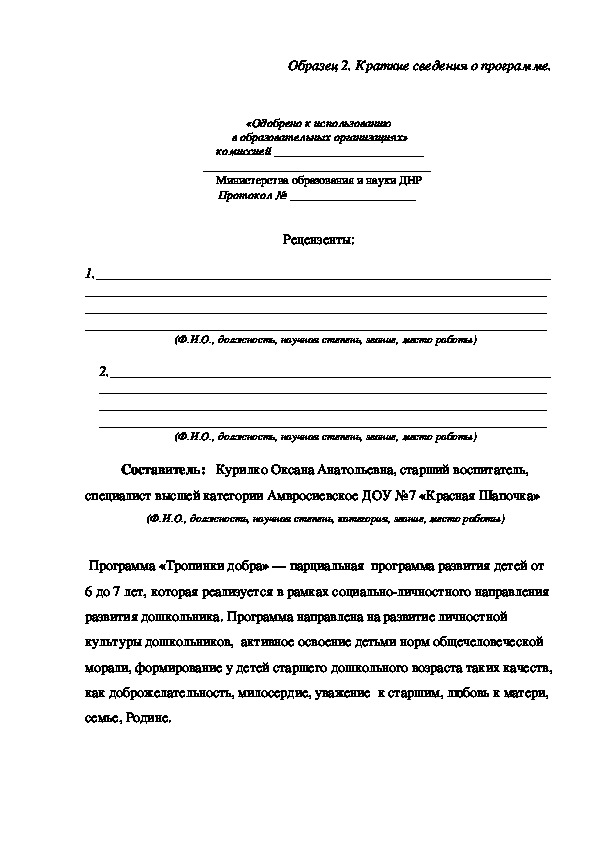 ДОНЕЦК – 2016Образец 2. Краткие сведения о программе.