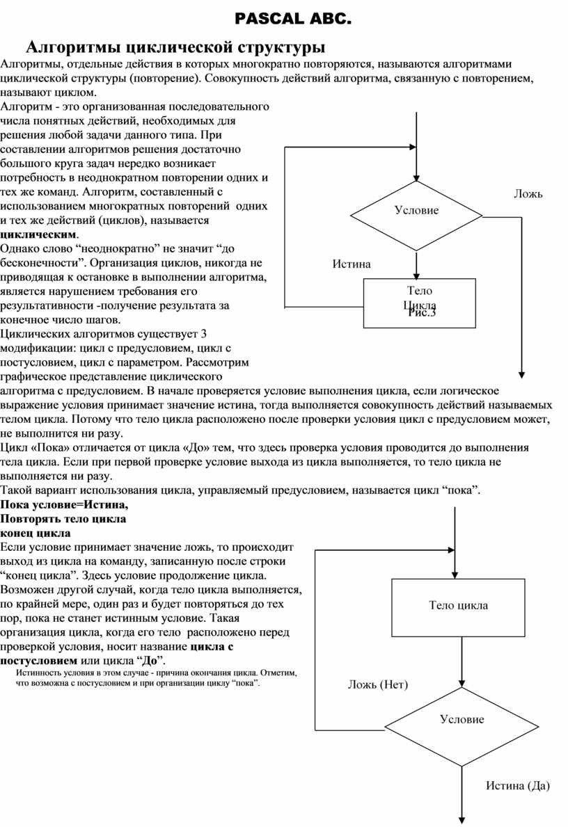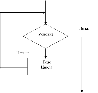 Циклических алгоритмов существует 3 модификации: цикл с предусловием, цикл с постусловием, цикл с параметром. Рассмотрим графическое представление циклического алгоритма с предусловием. В начале проверяется условие выполнения цикла, если логическое выражение условия принимает значение истина, тогда выполняется совокупность действий называемых телом цикла. Потому что тело цикла расположено после проверки условия цикл с предусловием может, не выполнится ни разу.