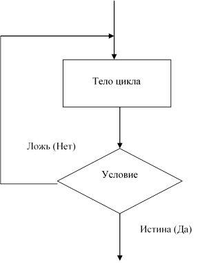 Возможен другой случай, когда тело цикла выполняется, по крайней мере, один раз и будет повторяться до тех пор, пока не станет истинным условие. Такая организация цикла, когда его тело расположено перед проверкой условия, носит название цикла с постусловием или цикла “До”.