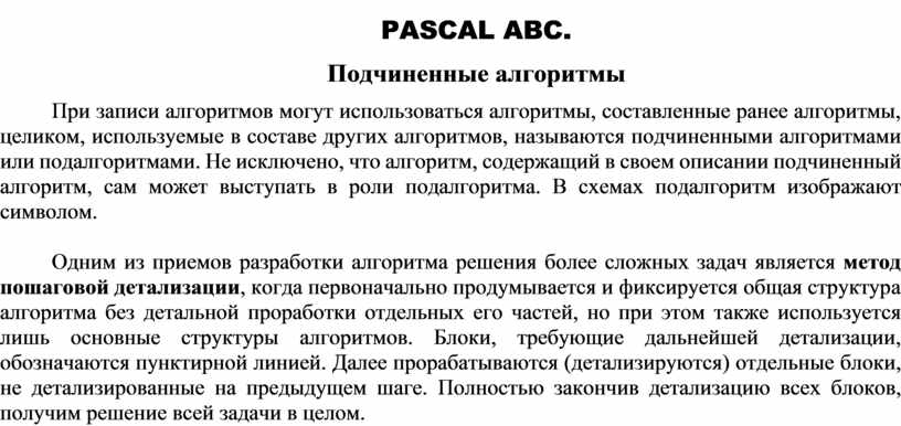 При записи алгоритмов могут использоваться алгоритмы, составленные ранее алгоритмы, целиком, используемые в составе других алгоритмов, называются подчиненными алгоритмами или подалгоритмами. Не исключено, что алгоритм, содержащий в своем описании подчиненный алгоритм, сам может выступать в роли подалгоритма. В схемах подалгоритм изображают символом.