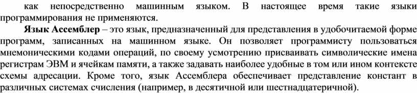 Язык Ассемблер – это язык, предназначенный для представления в удобочитаемой форме программ, записанных на машинном языке. Он позволяет программисту пользоваться мнемоническими кодами операций, по своему усмотрению присваивать символические имена регистрам ЭВМ и ячейкам памяти, а также задавать наиболее удобные в том или ином контексте схемы адресации. Кроме того, язык Ассемблера обеспечивает представление констант в различных системах счисления (например, в десятичной или шестнадцатеричной).
