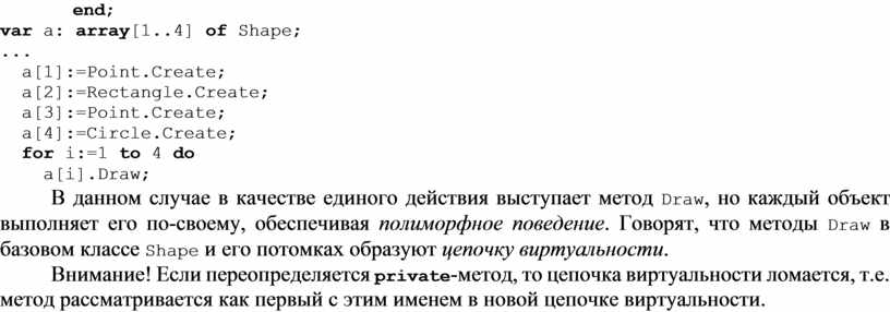В данном случае в качестве единого действия выступает метод Draw, но каждый объект выполняет его по-своему, обеспечивая полиморфное поведение. Говорят, что методы Draw в базовом классе Shape и его потомках образуют цепочку виртуальности.