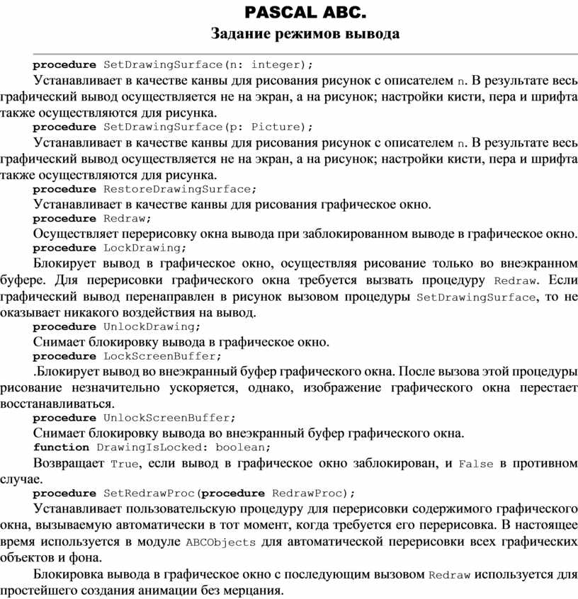 Блокирует вывод в графическое окно, осуществляя рисование только во внеэкранном буфере. Для перерисовки графического окна требуется вызвать процедуру Redraw. Если графический вывод перенаправлен в рисунок вызовом процедуры SetDrawingSurface, то не оказывает никакого воздействия на вывод.