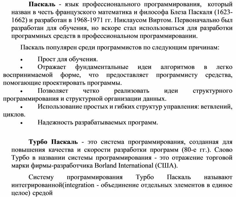 Паскаль - язык профессионального программирования, который назван в честь французского математика и философа Блеза Паскаля (1623- 1662) и разработан в 1968-1971 гг. Никлаусом Виртом. Первоначально был разработан для обучения, но вскоре стал использоваться для разработки программных средств в профессиональном программировании.