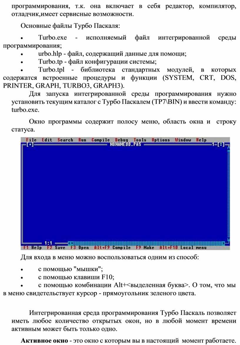 Интегрированная среда программирования Турбо Паскаль позволяет иметь любое количество открытых окон, но в любой момент времени активным может быть только одно.