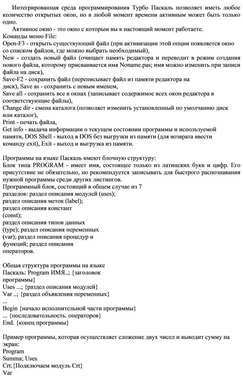 Систему программирования Турбо Паскаль называют интегрированной (integration - объединение отдельных элементов в единое целое) средой программирования, т.к. она включает в себя редактор, компилятор, отладчик, имеет сервисные возможности.